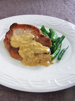 豚ロース肉をこんがりと焼いて、フレンチマスタードのきいたソースで仕上げます。
