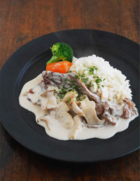牛もも薄切り肉をマッシュルームやエリンギを入れたキノコクリームでさっと煮込みます。バターライスを添えます。