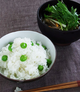 今月は初夏の和食です。 豆ごはん 旬のグリーンピースを使ったご飯で…