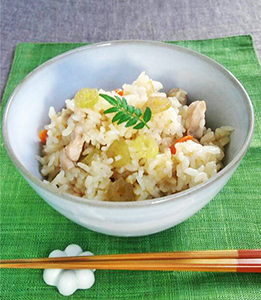 3月は春の和食です。 山菜おこわ 蕗(フキ)とタケノコを使って、鶏…